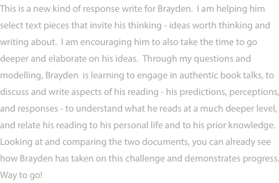 Teacher comment explaining the learning task and student’s work in completing thoughtful double-entry journal writes.